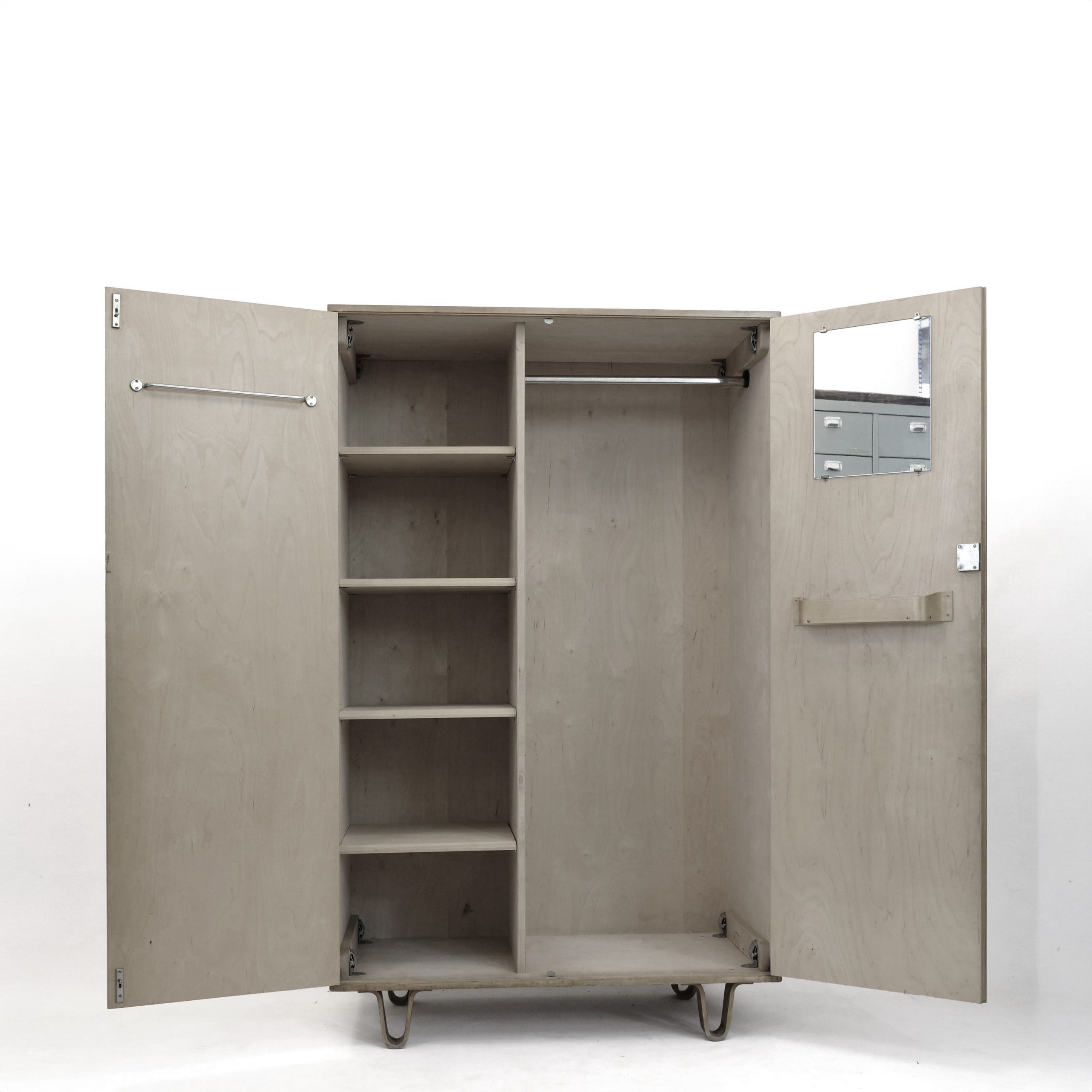 Elle ouvre par 2 portes révélant 4 étagères à gauche et une penderie à droite.