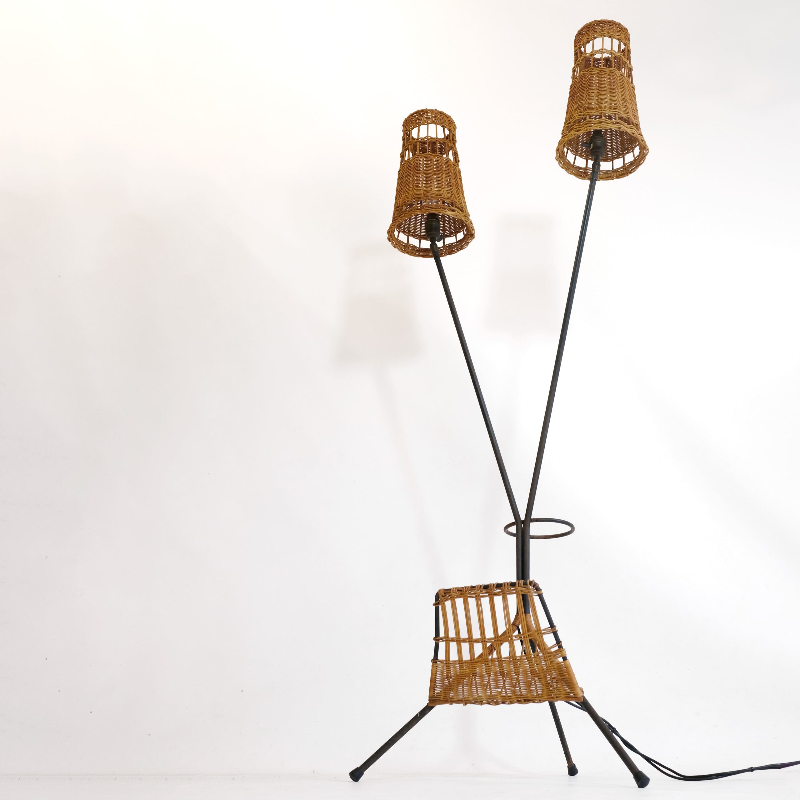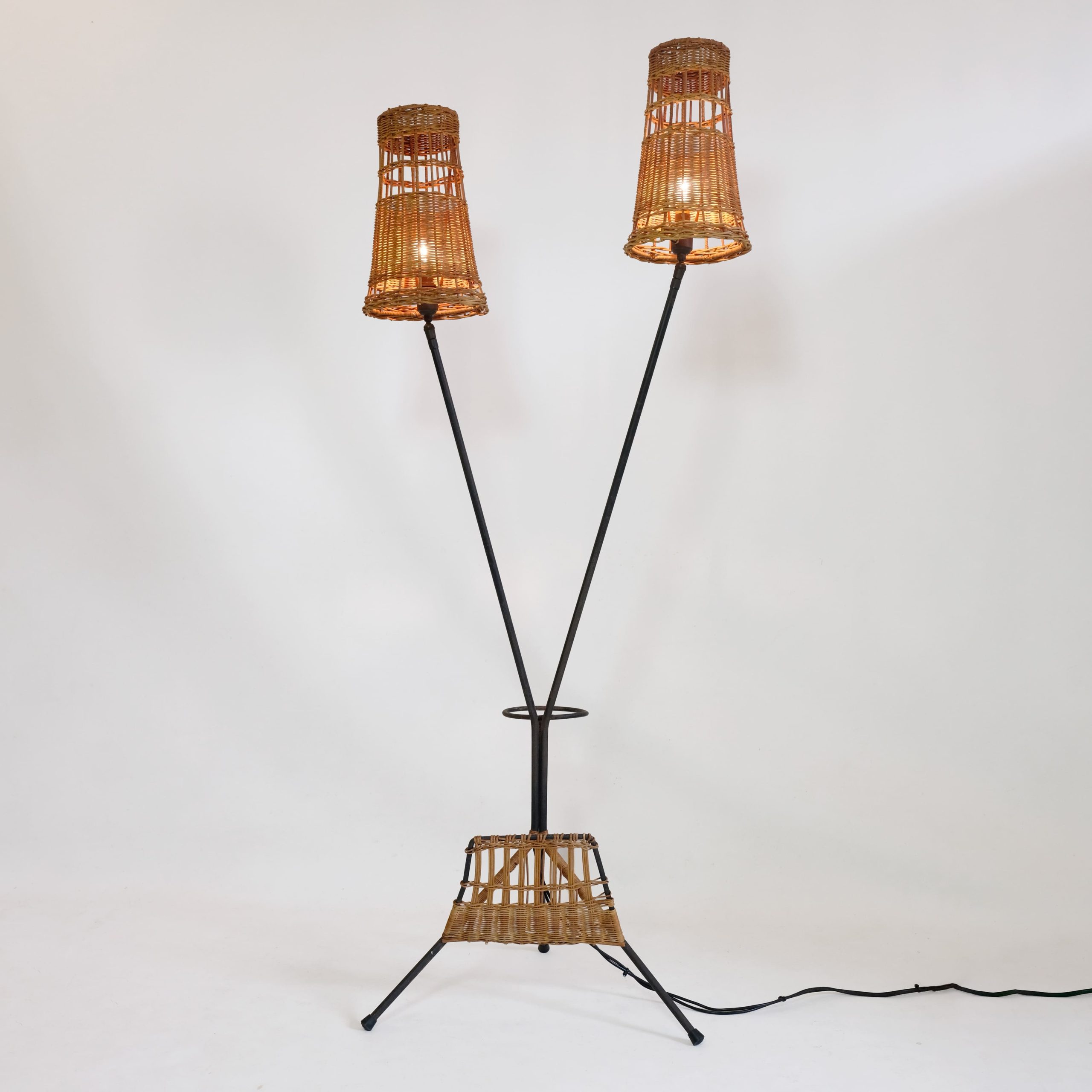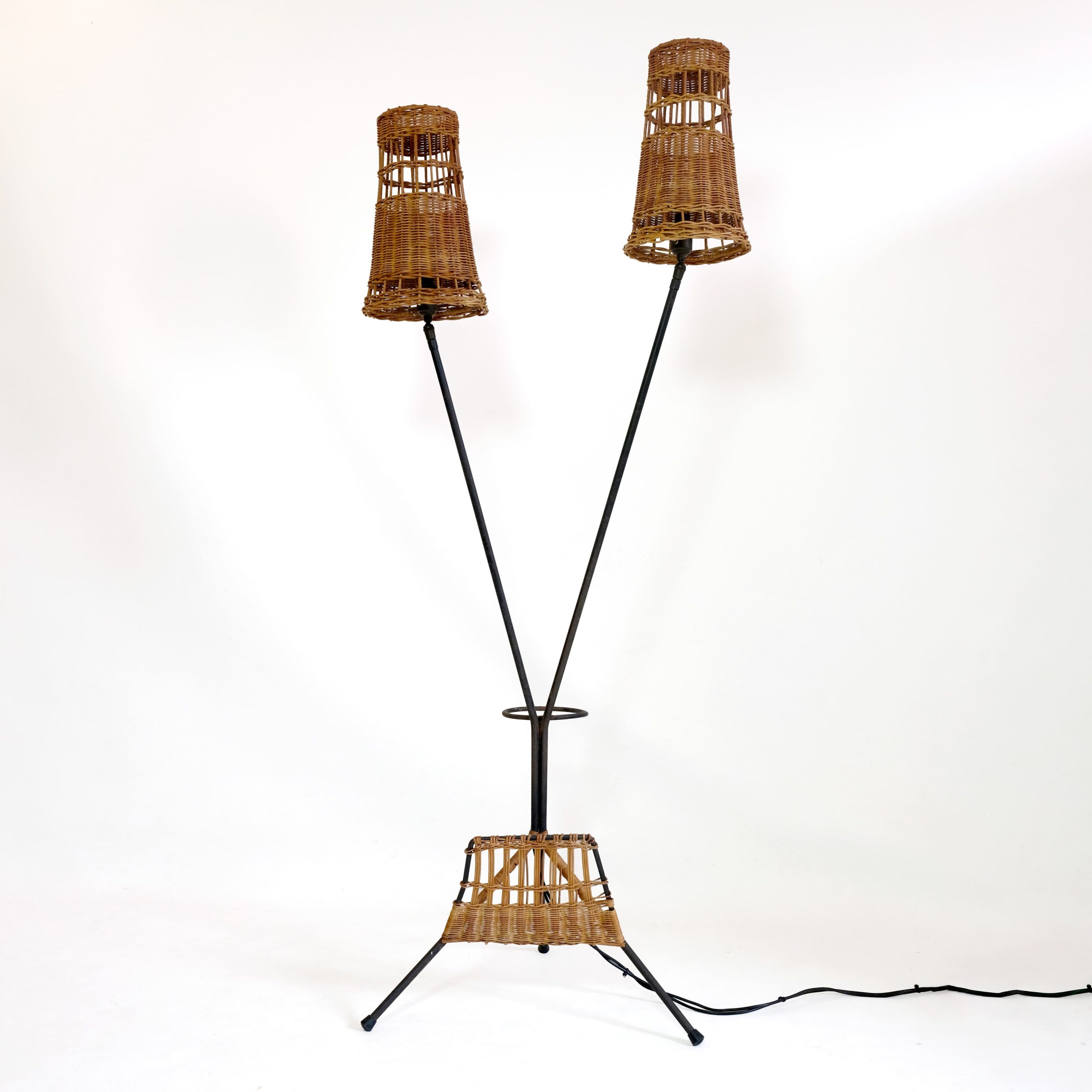 French wicker and metal floor lamp with 2 lights, 1950-1960.