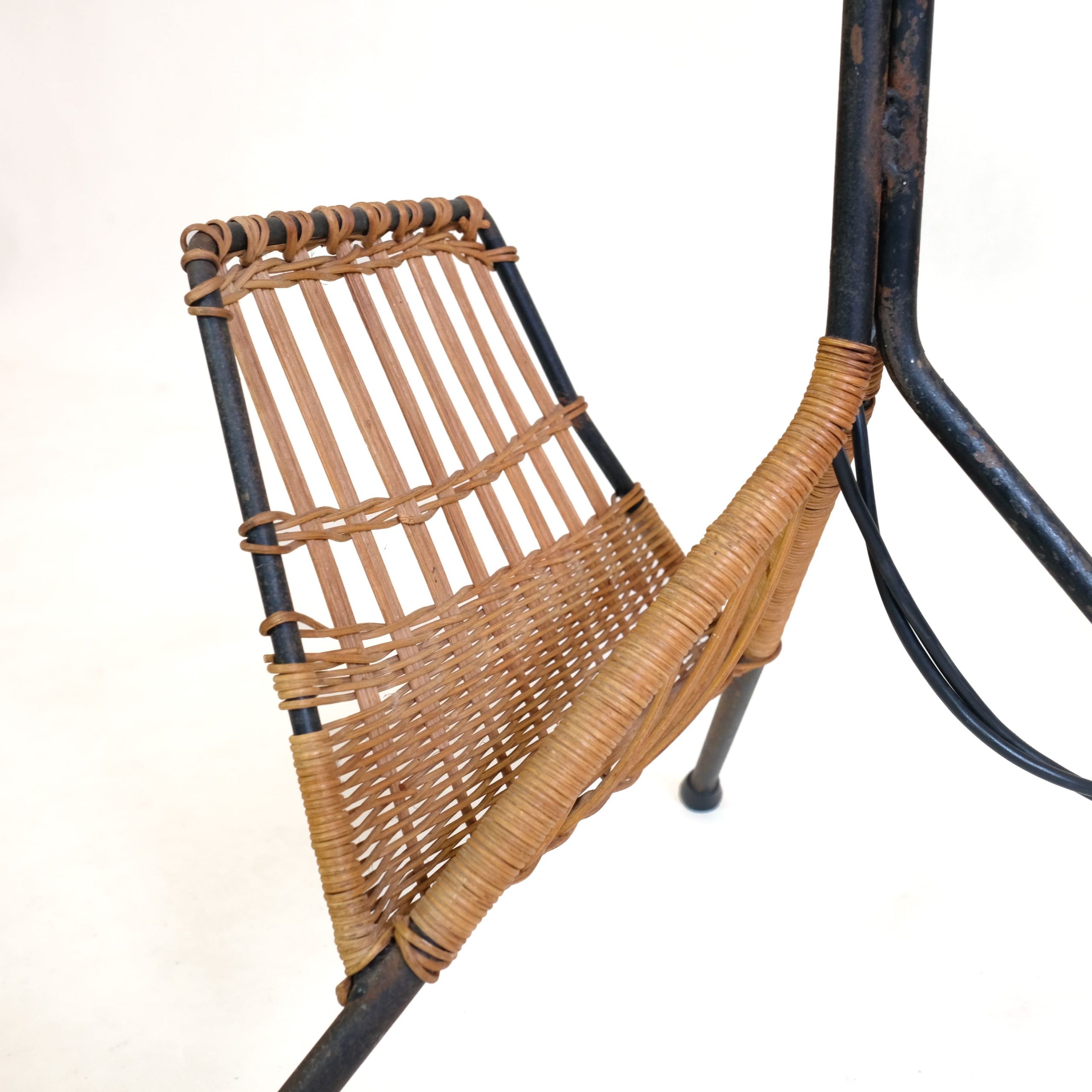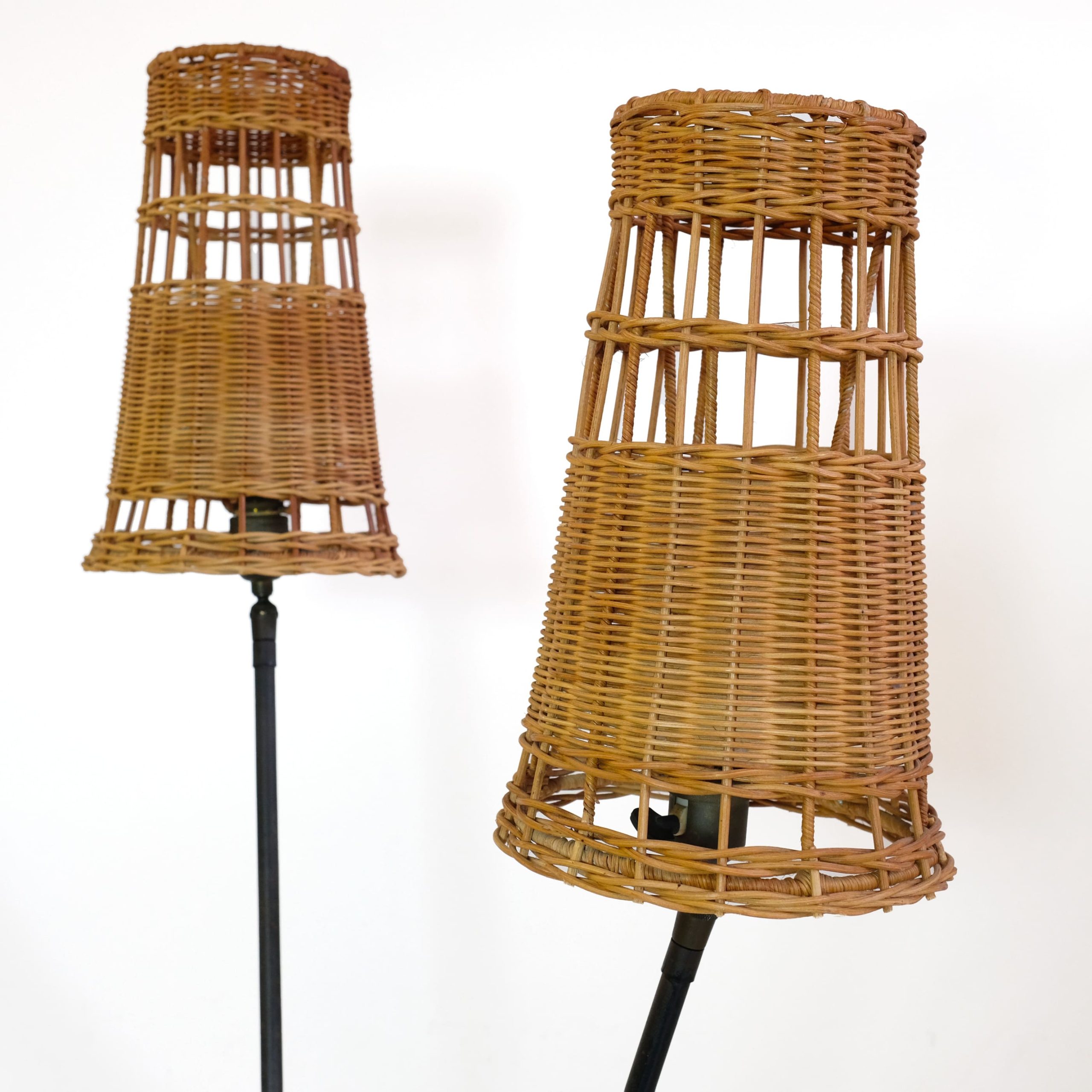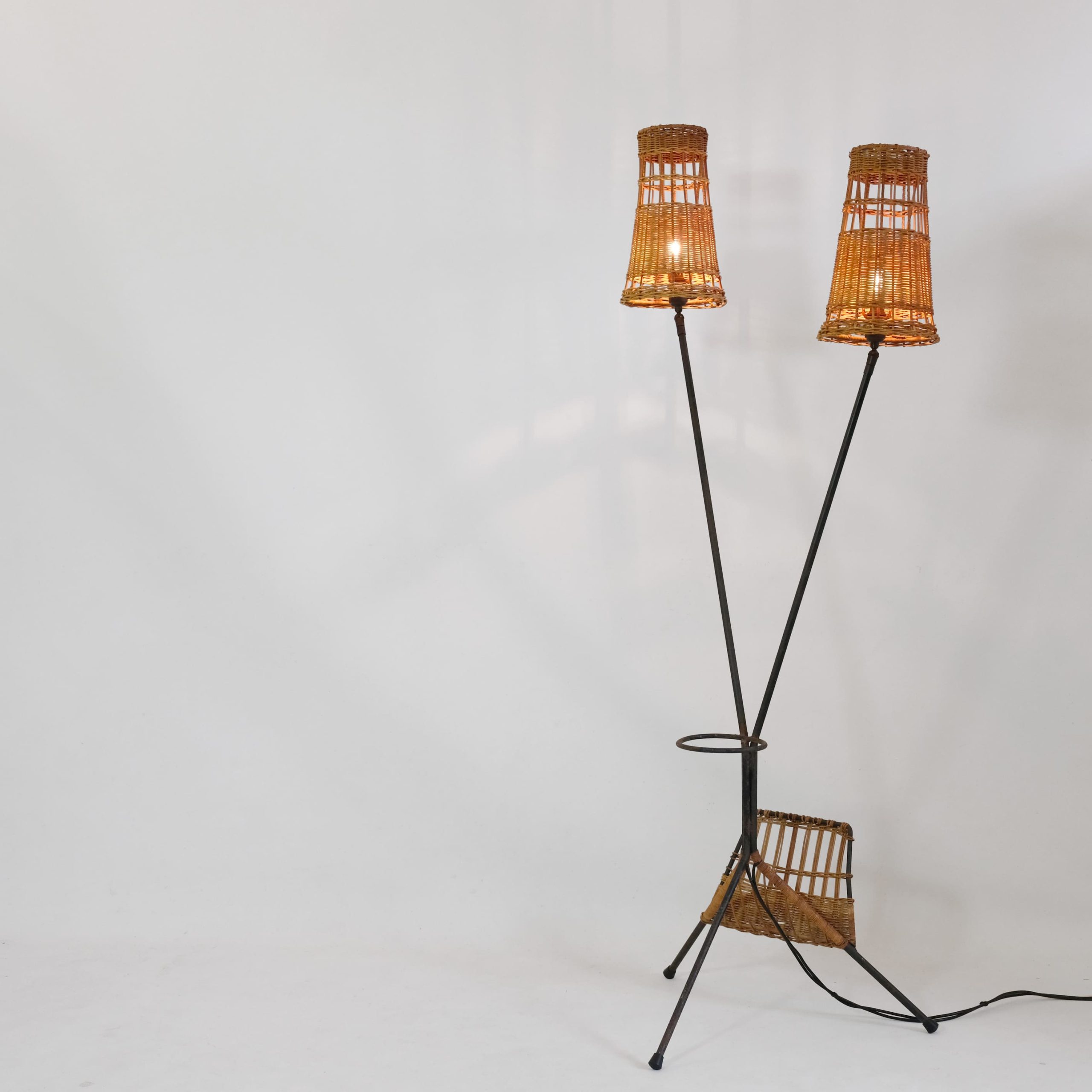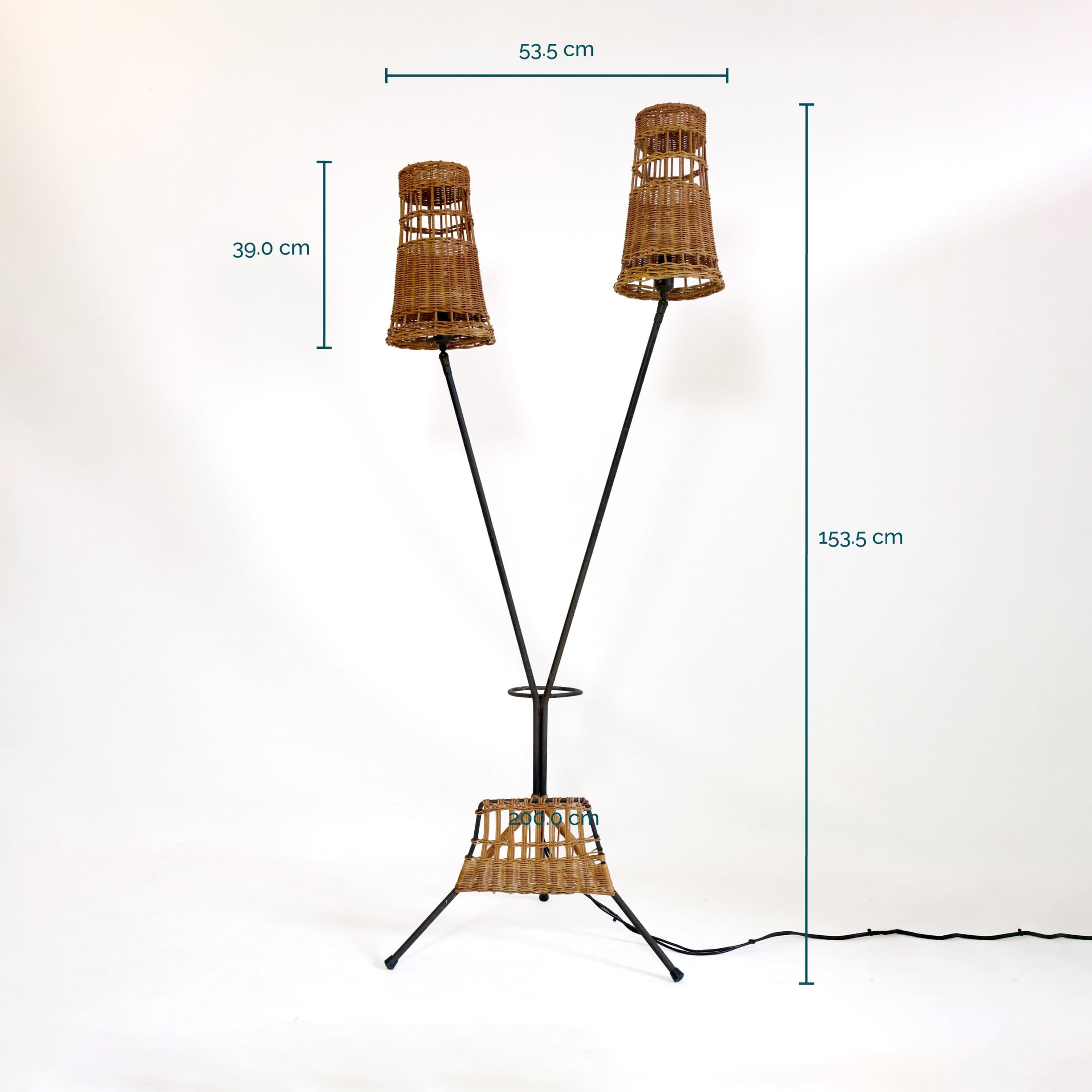 French wicker and metal floor lamp with 2 lights, 1950-1960.