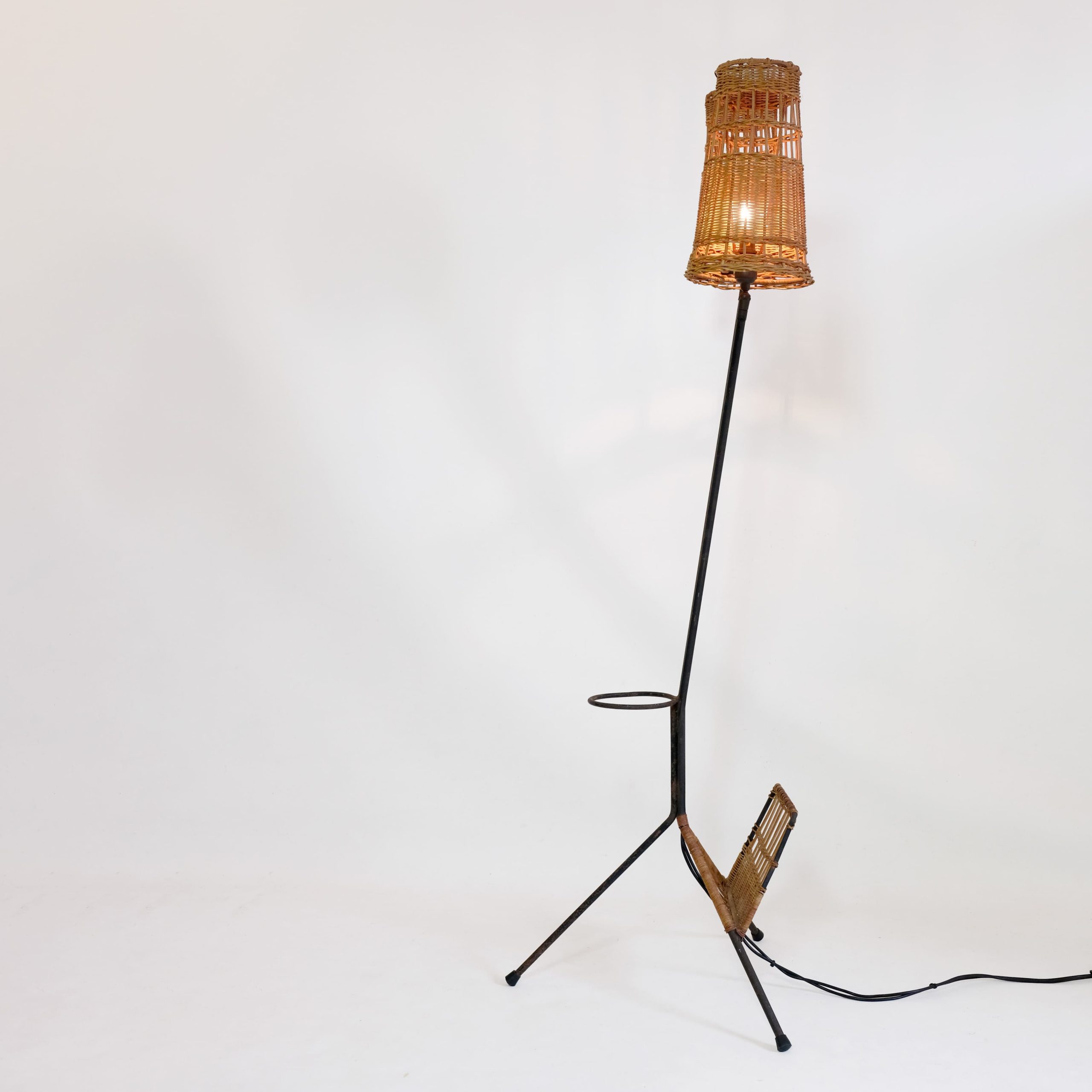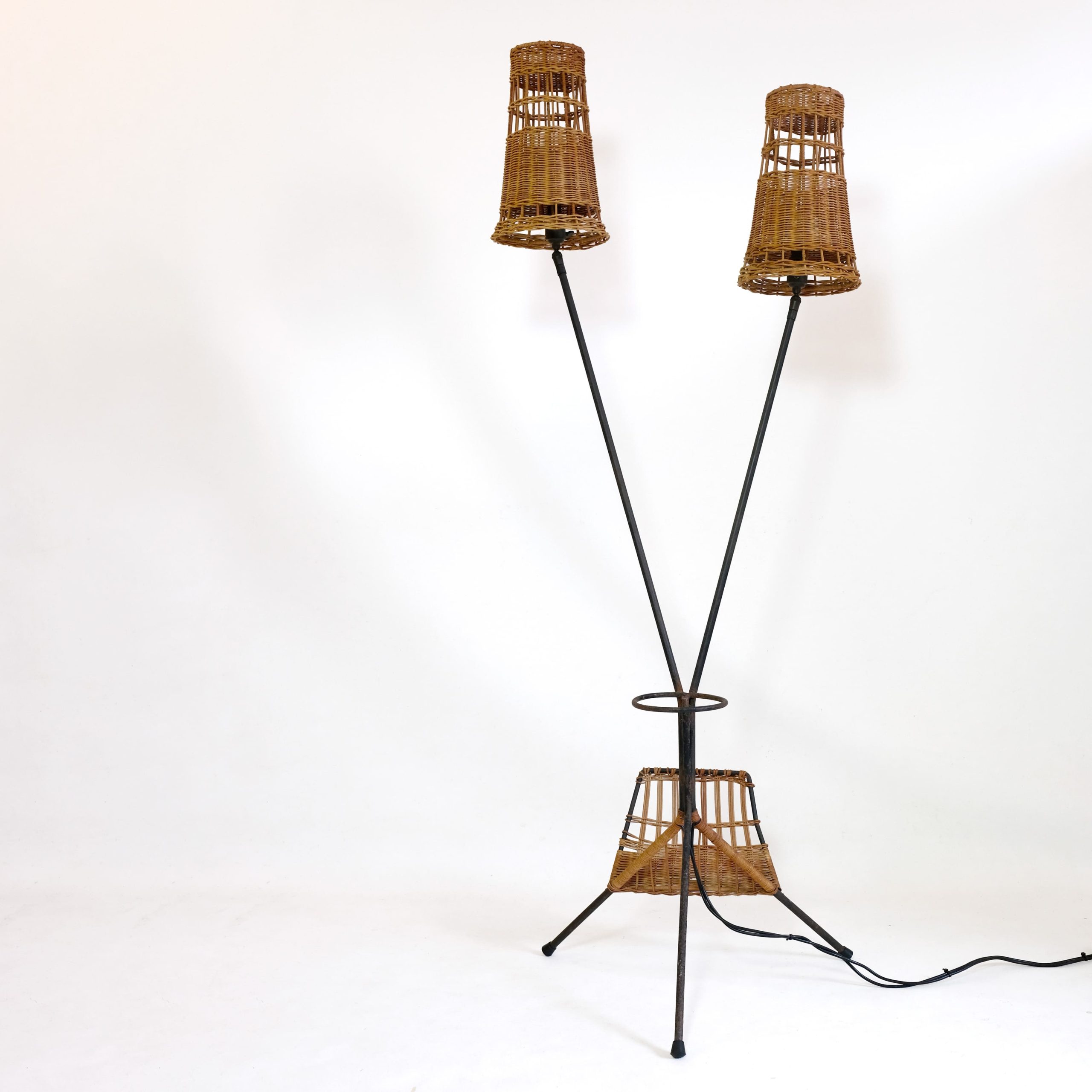 3. French wicker and metal floor lamp with 2 lights, 1950-1960.