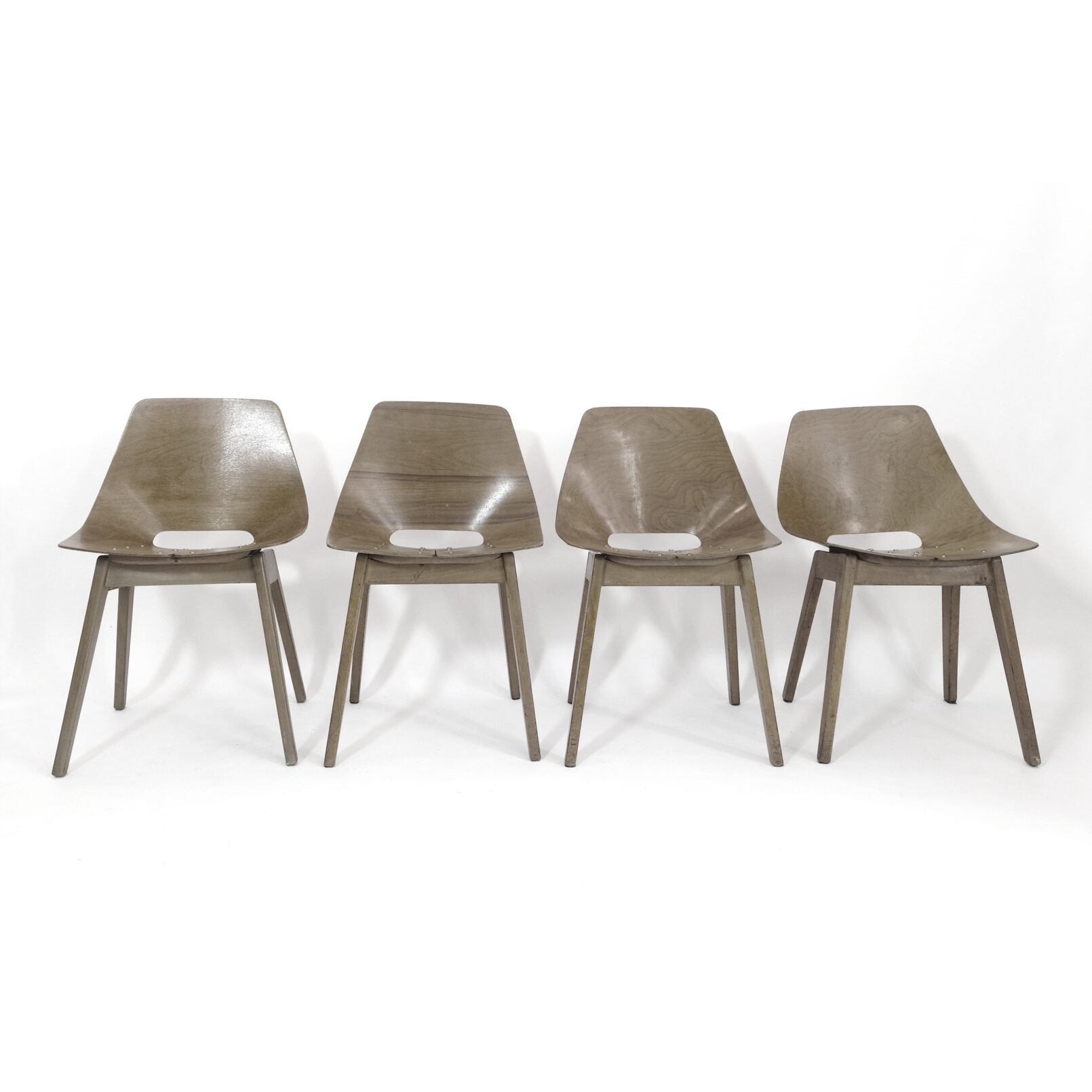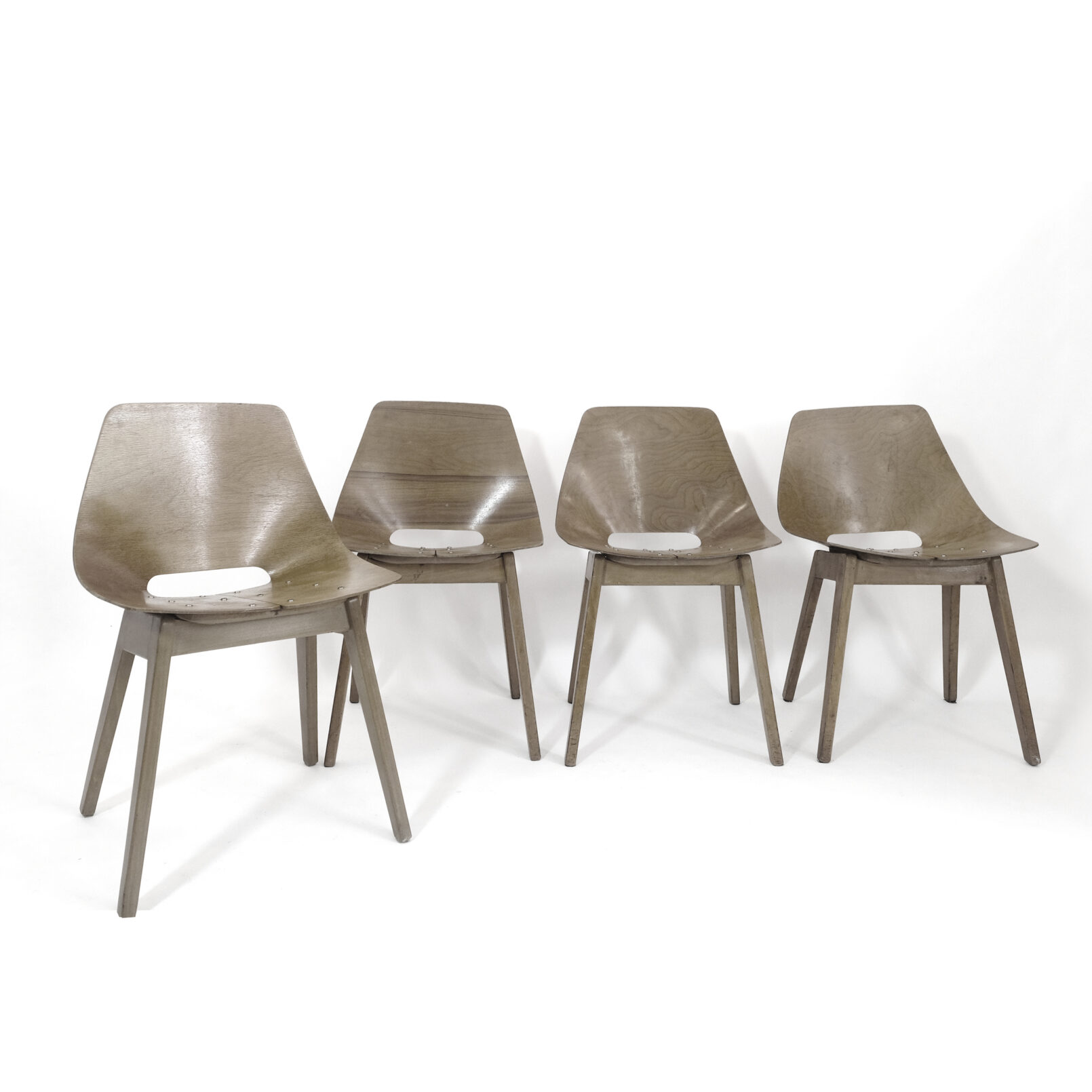 Pierre Guariche, série de 4 chaises tonneau, piétement bois, Steiner, 1950s.