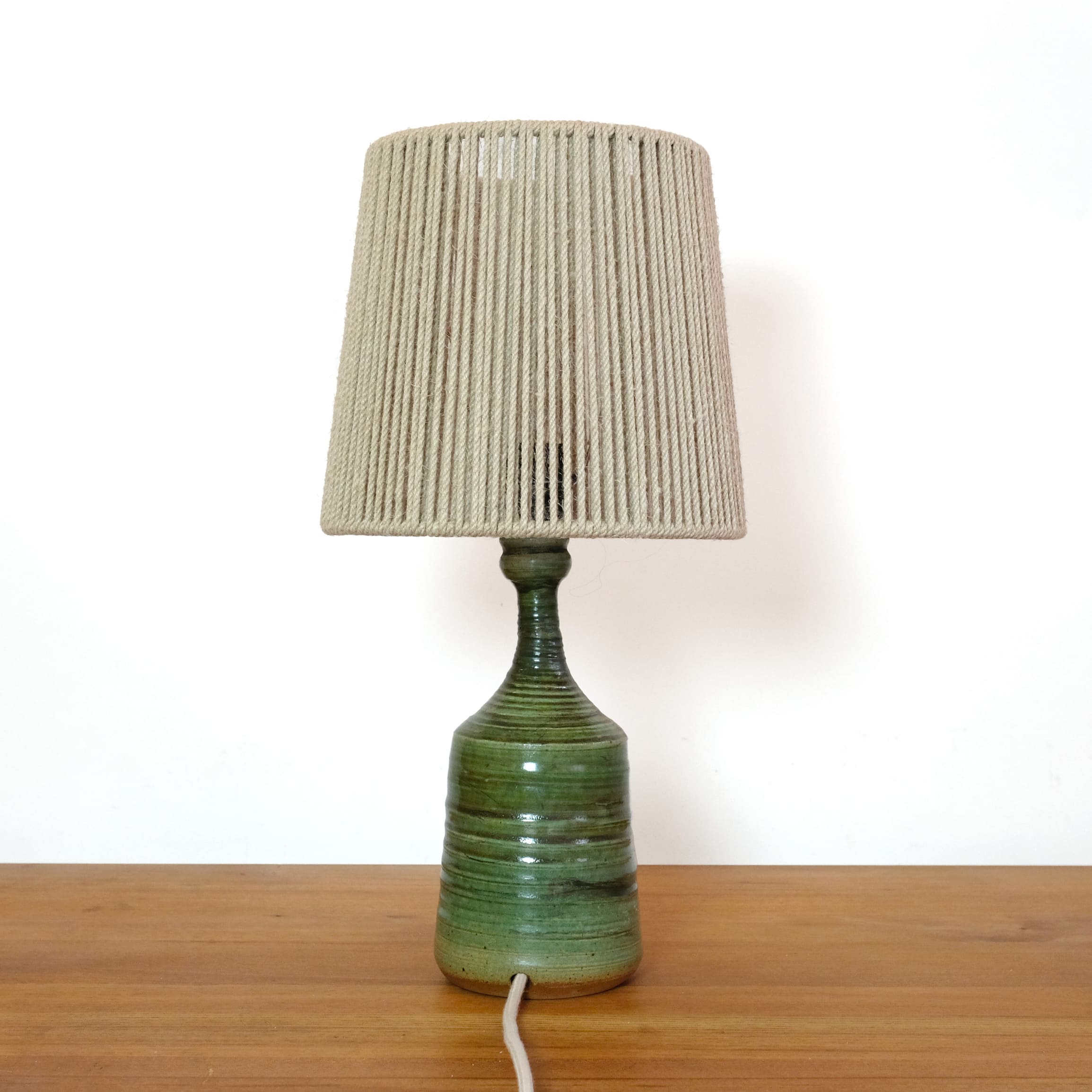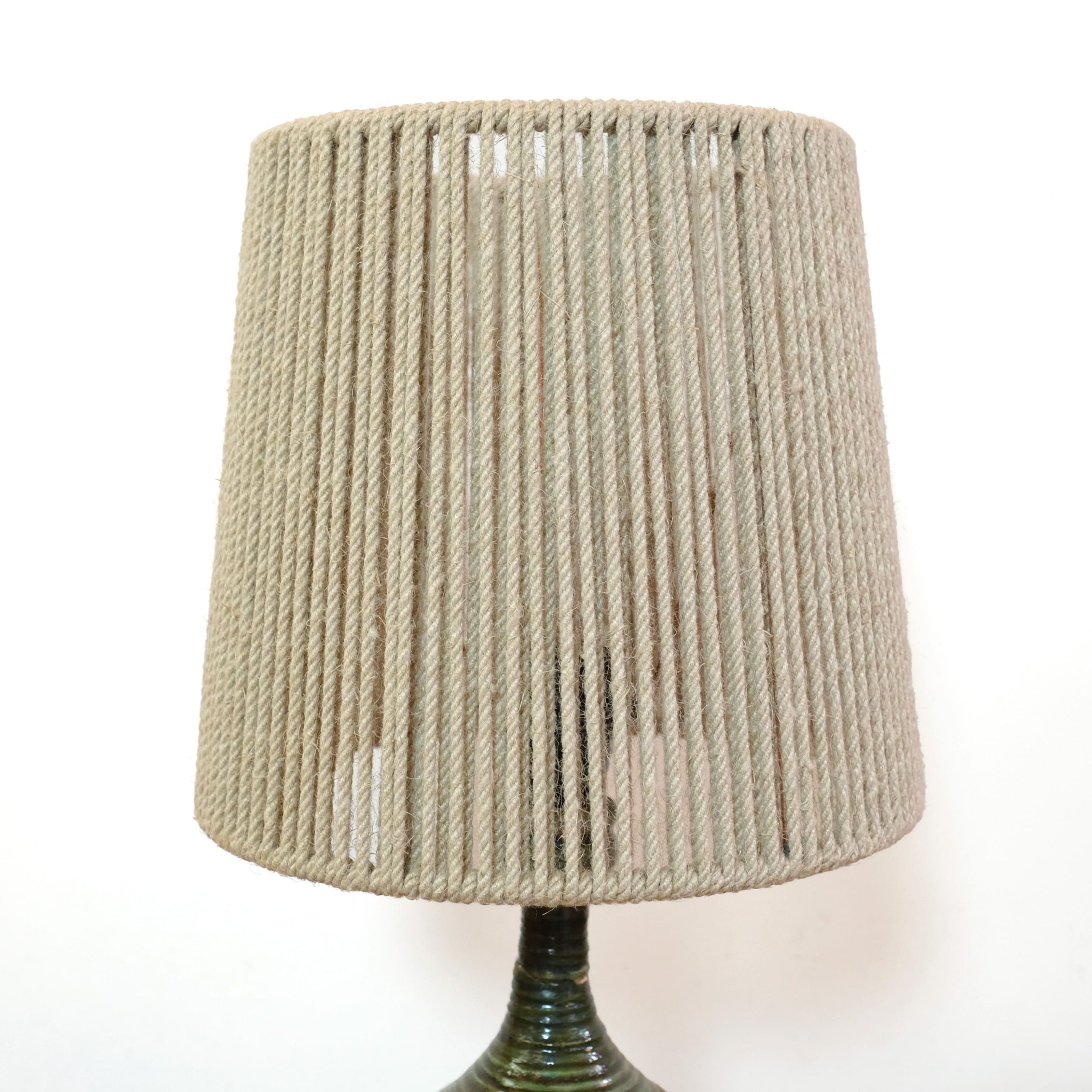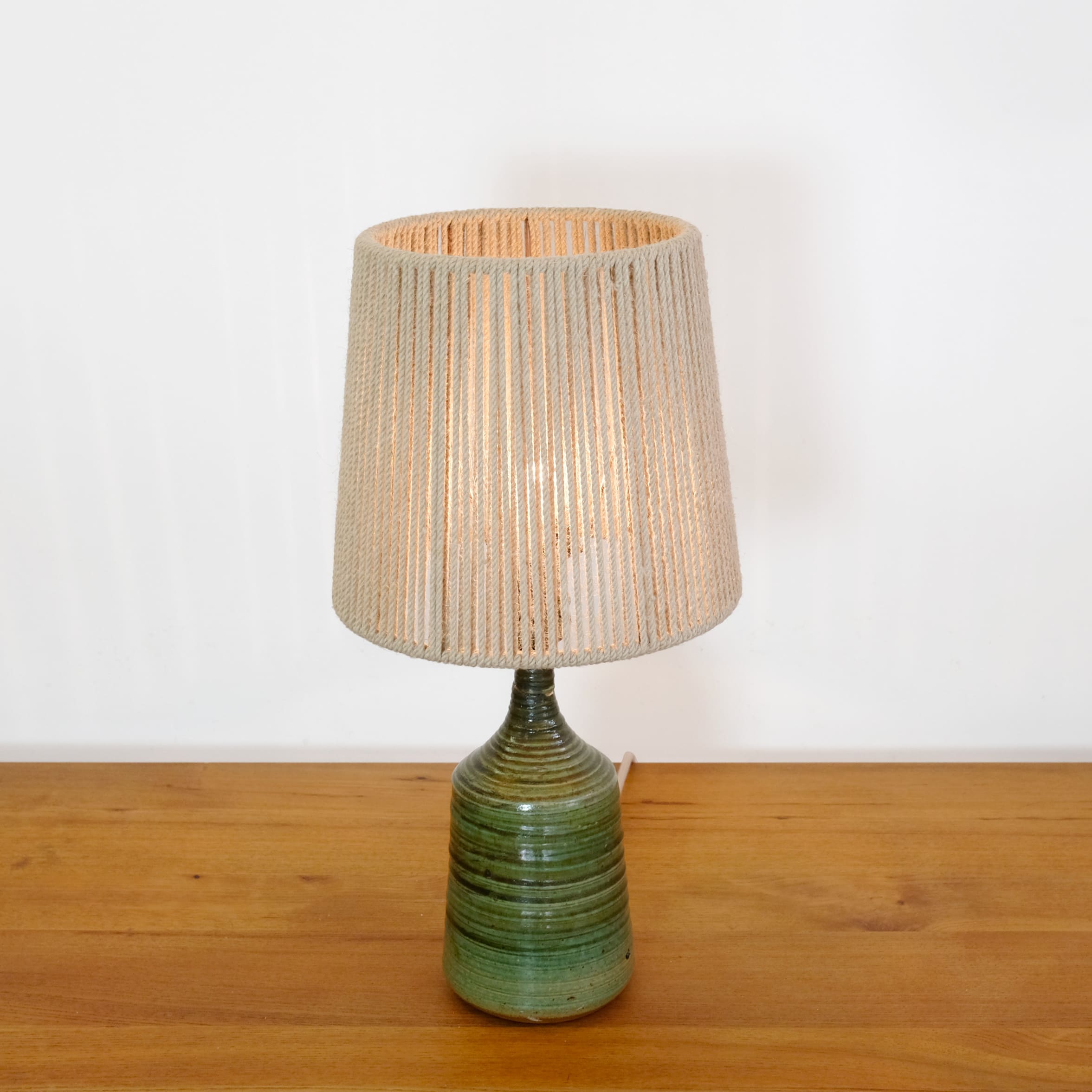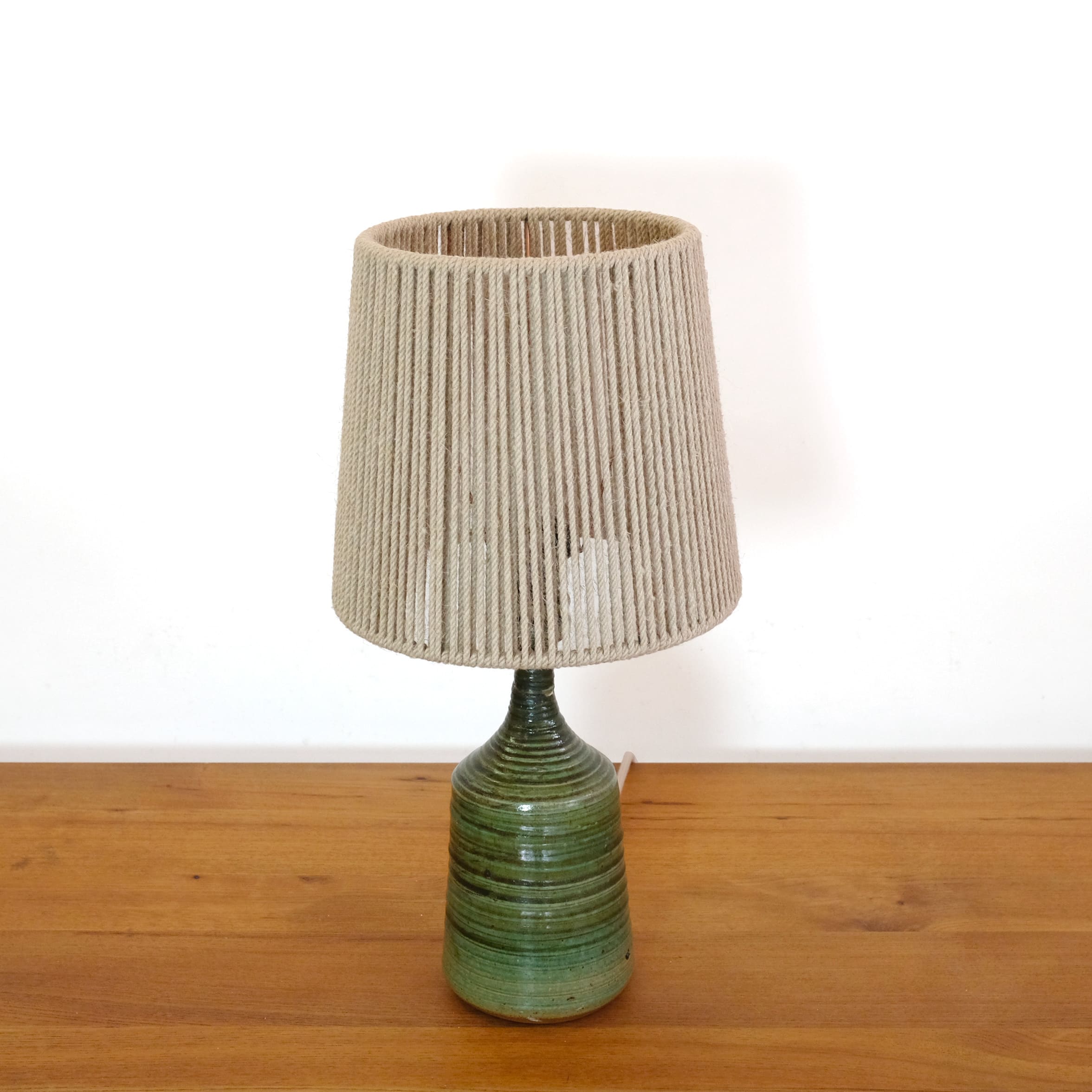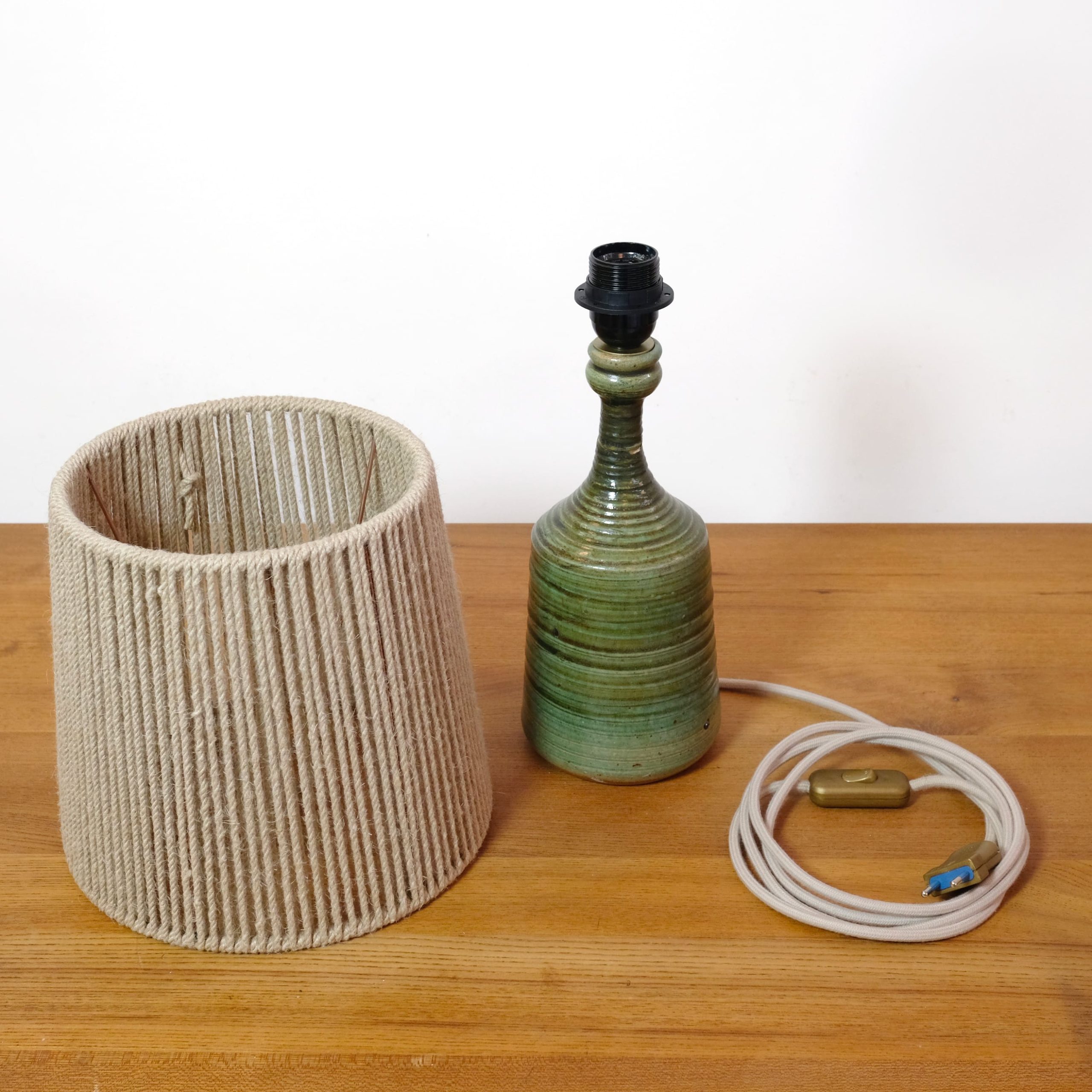 Lampe en grès émaillé vert et son abat-jour en corde de chanvre.