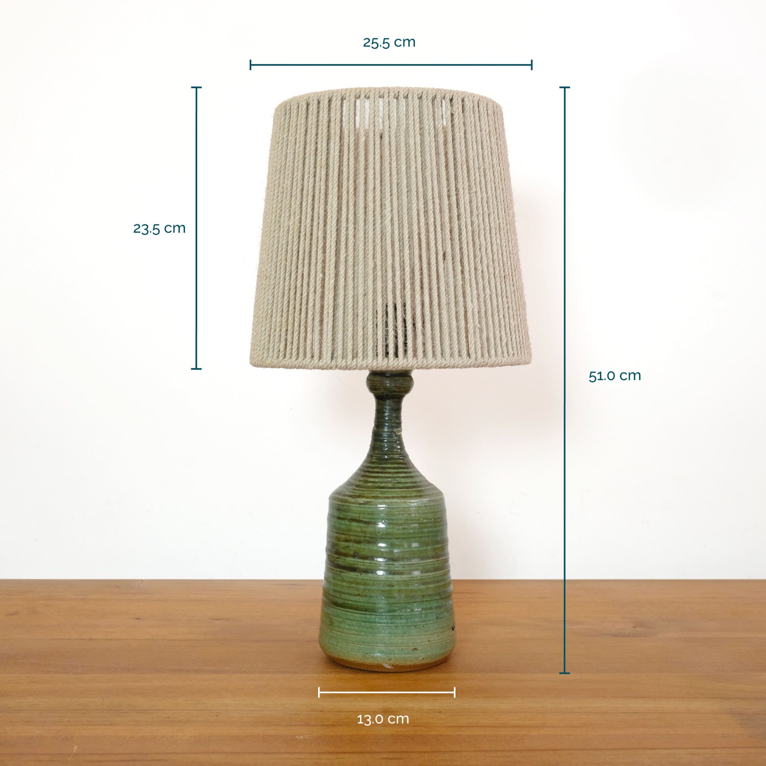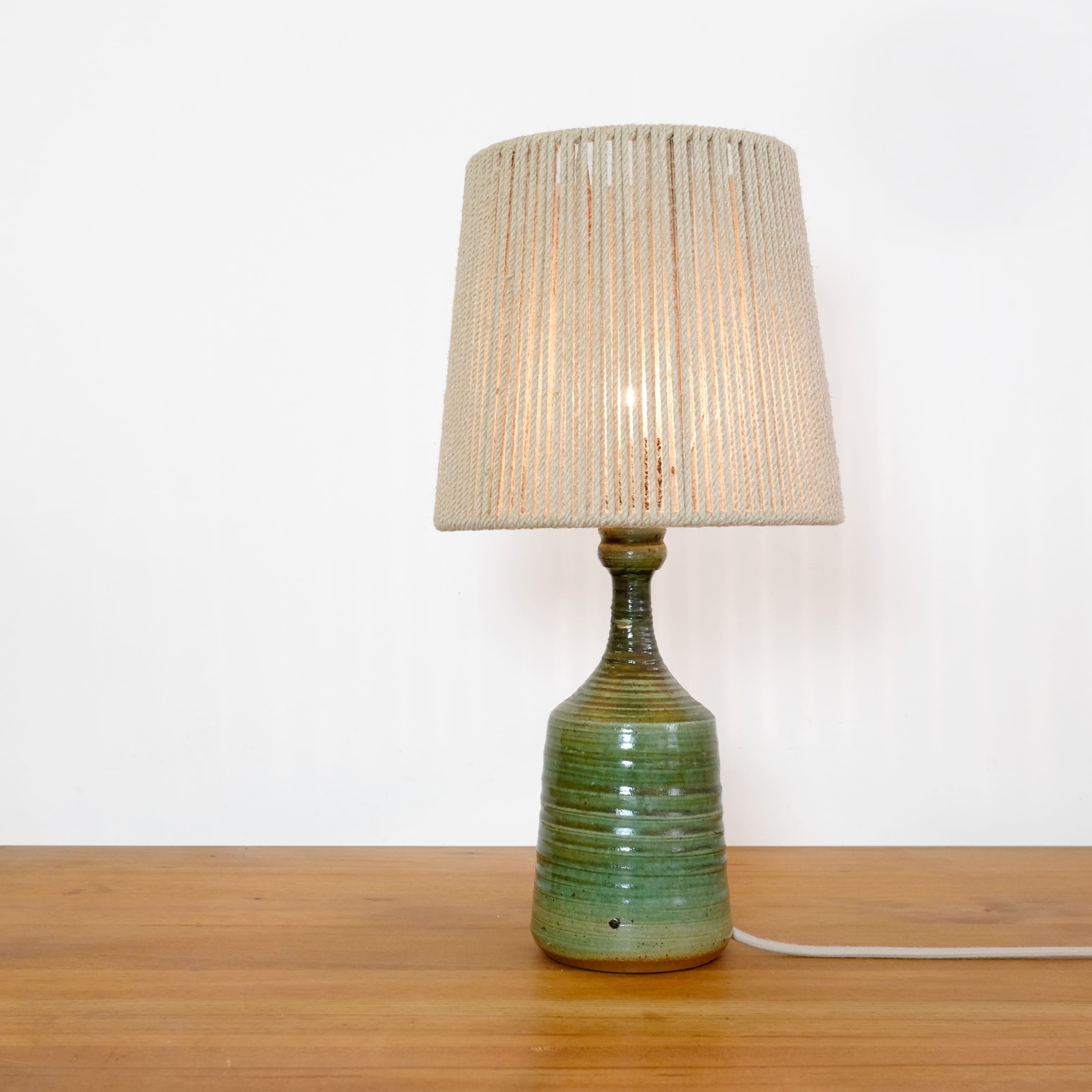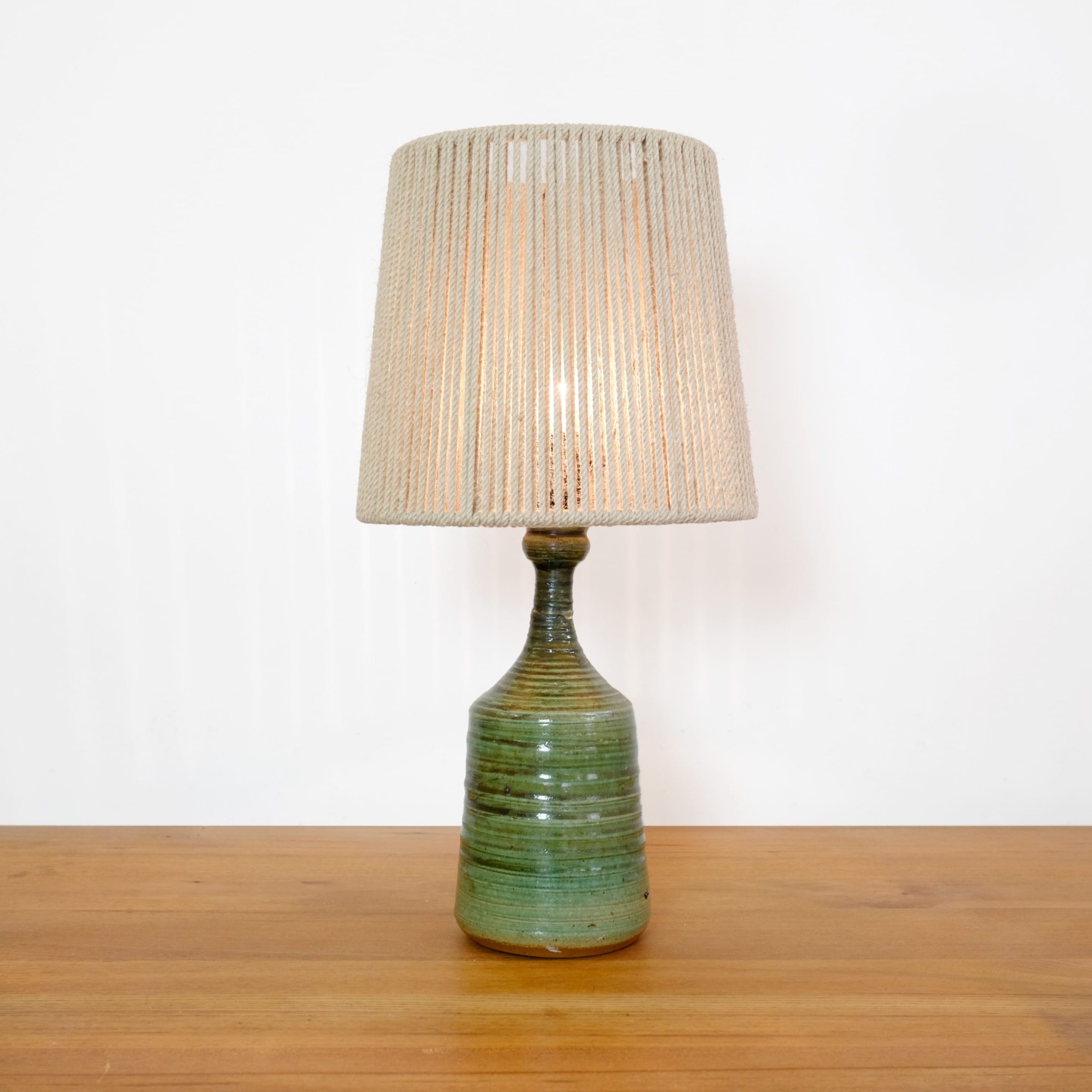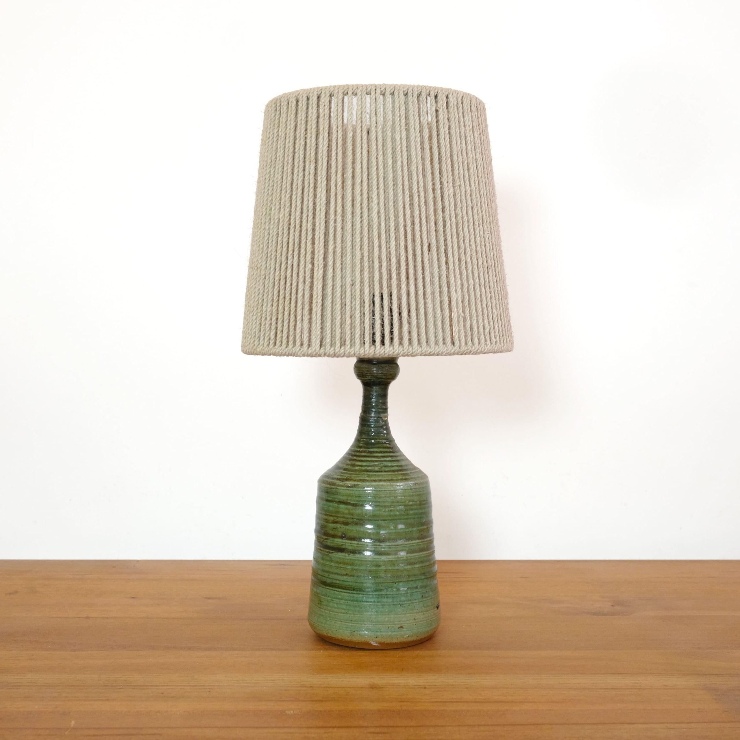 Lampe en grès émaillé vert et son abat-jour en corde de chanvre.