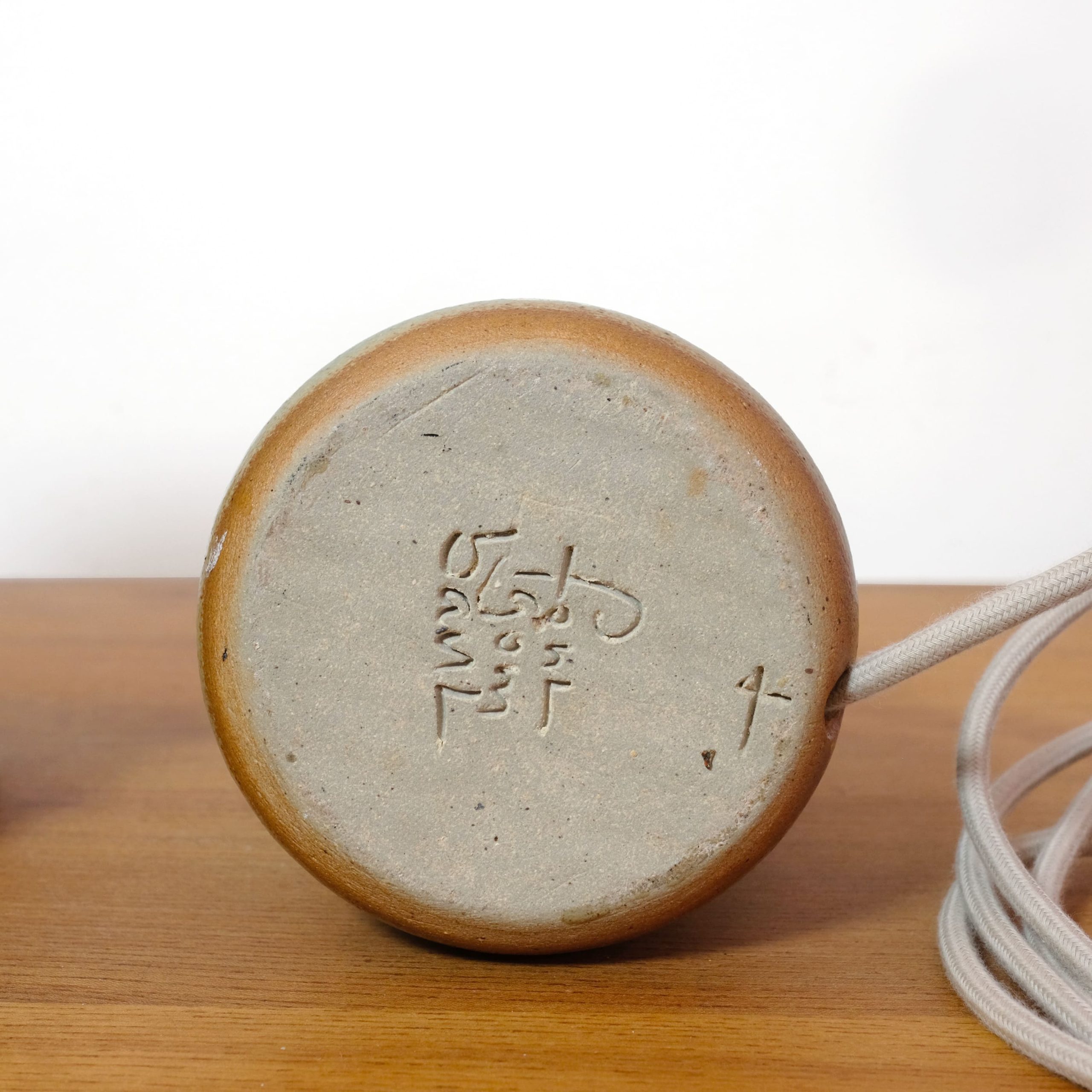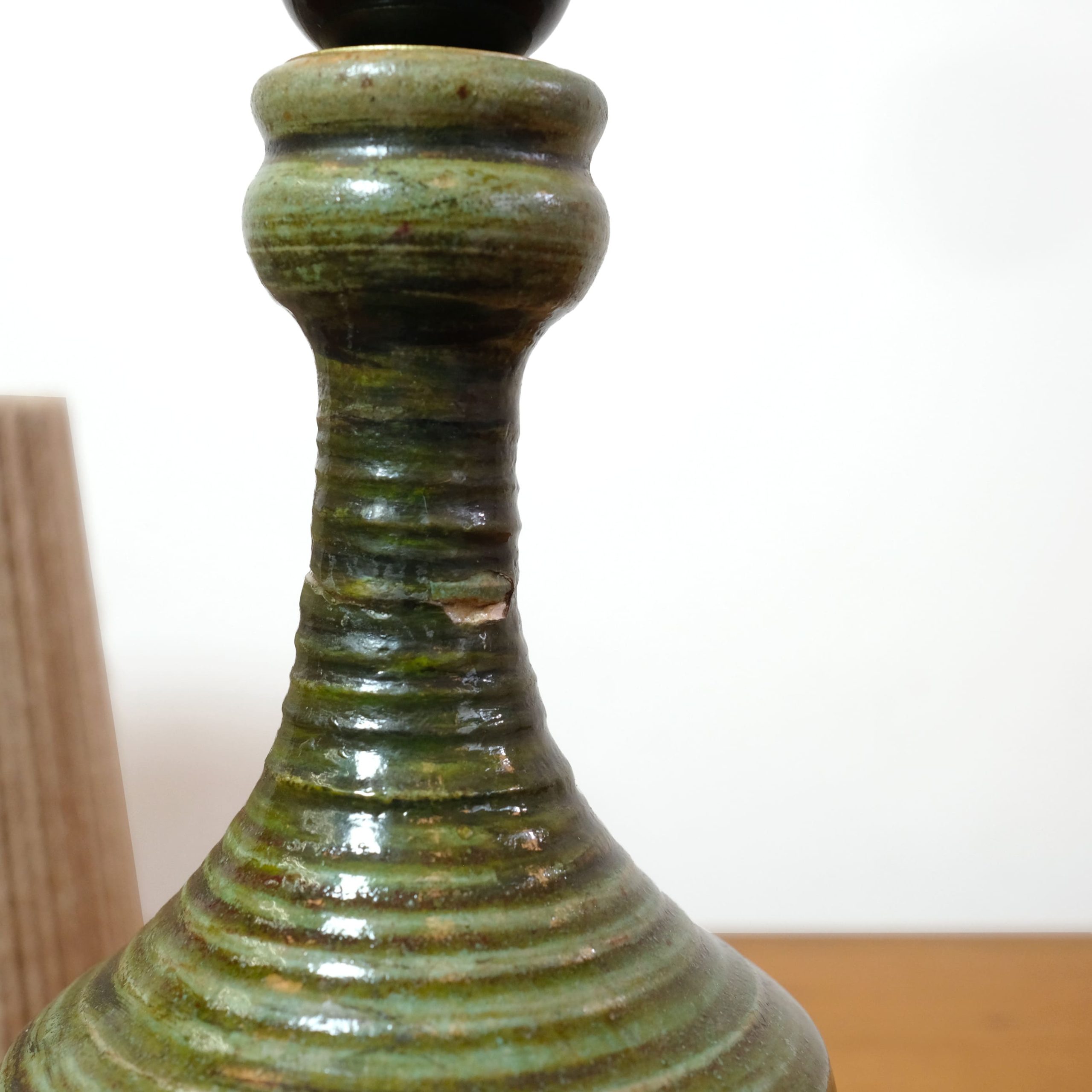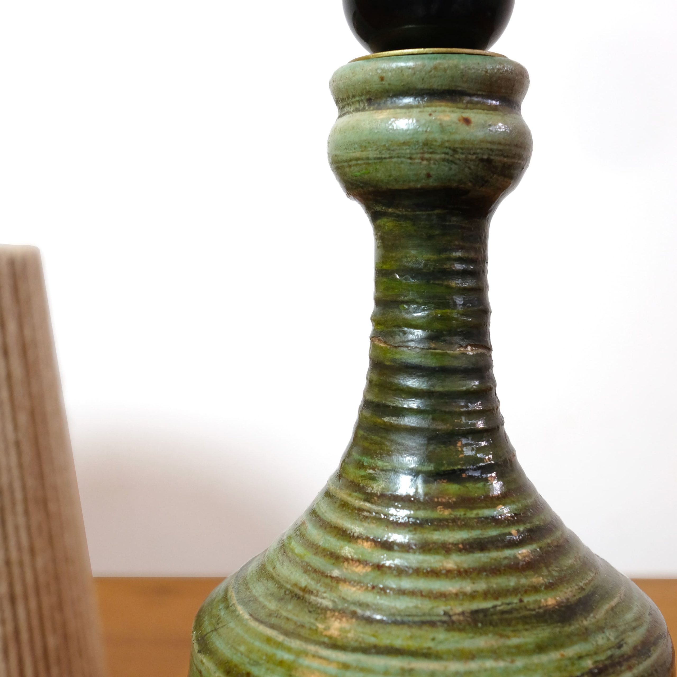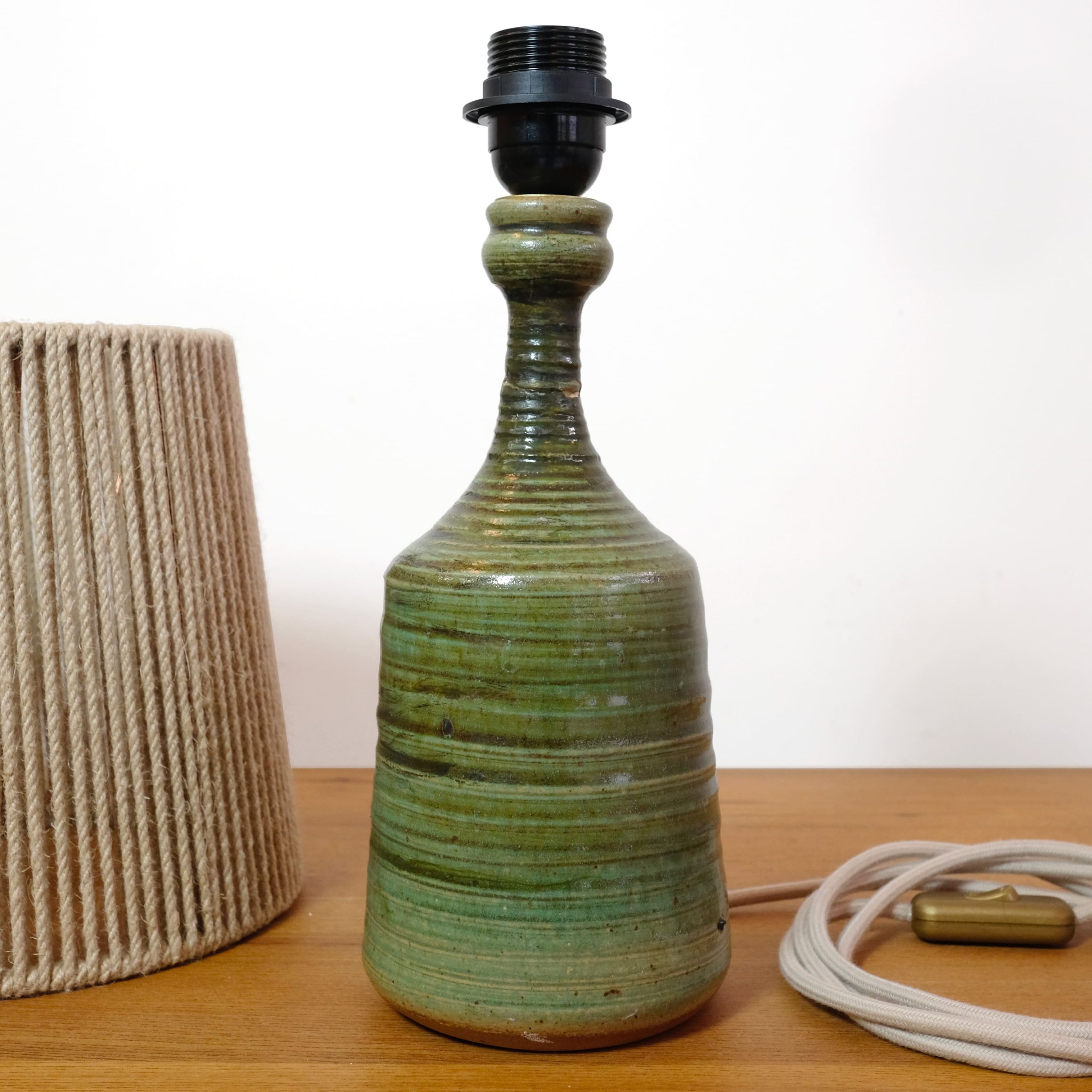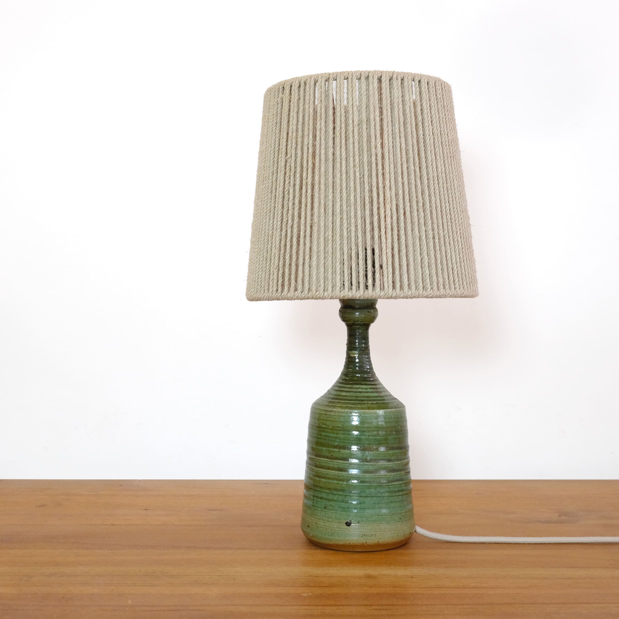 Lampe en grès émaillé vert et son abat-jour en corde de chanvre.