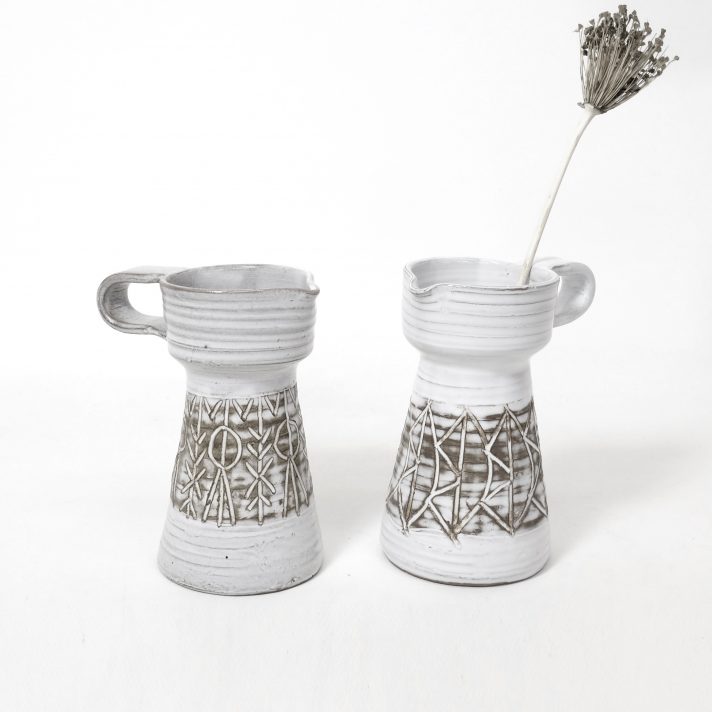 Les Argonautes, paire de pichets en céramique à décor géométrique sur fond crème.